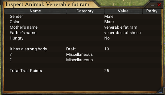 Ved at højreklikke på et dyr og vælge "Inspect animal" kan mas se hvilke traits dyret har.