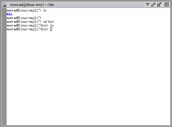 I ovenstående eksempel kan vi se brugeren monrad har først kørt kommandoen ls, der viser indholdet af nuværende mappe, som tilden viser er hans home (/home/monrad).