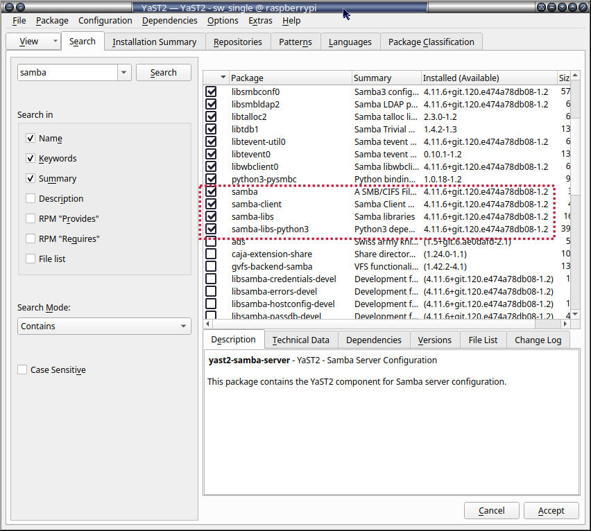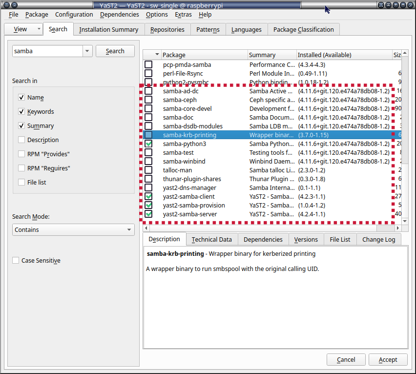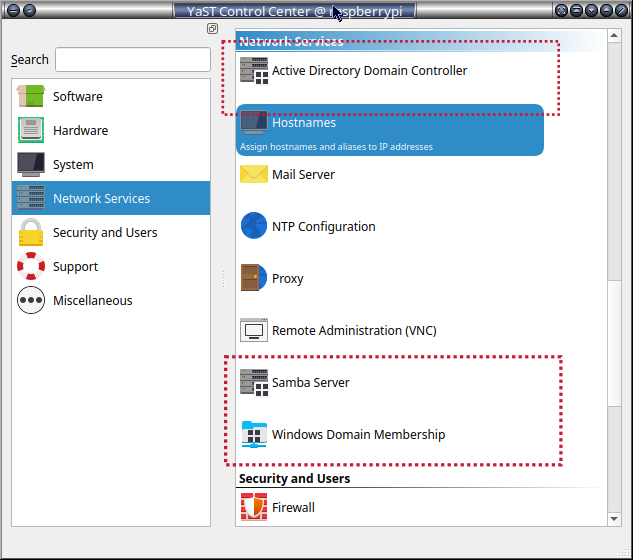 Med fordel kan Yast-administration af Samba installeres.